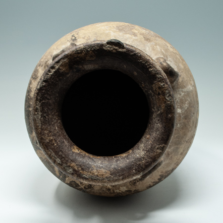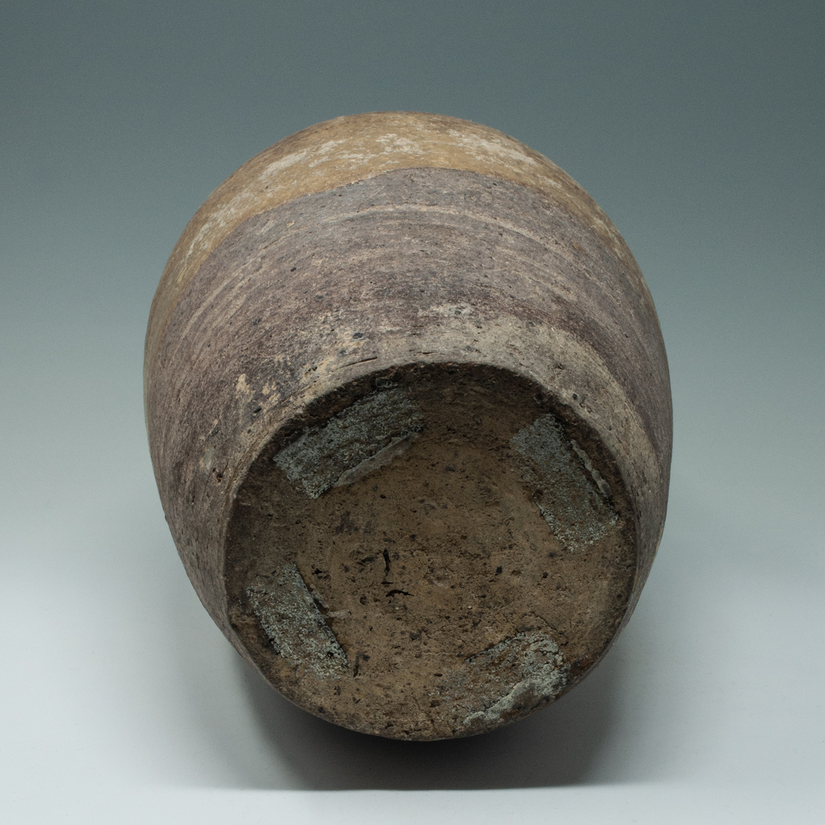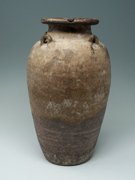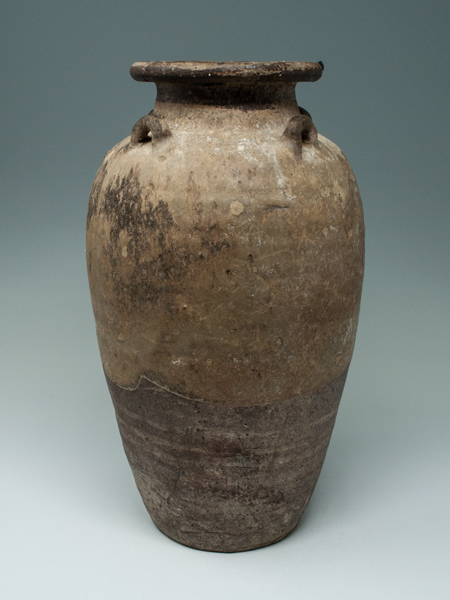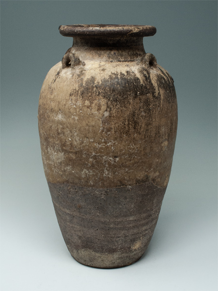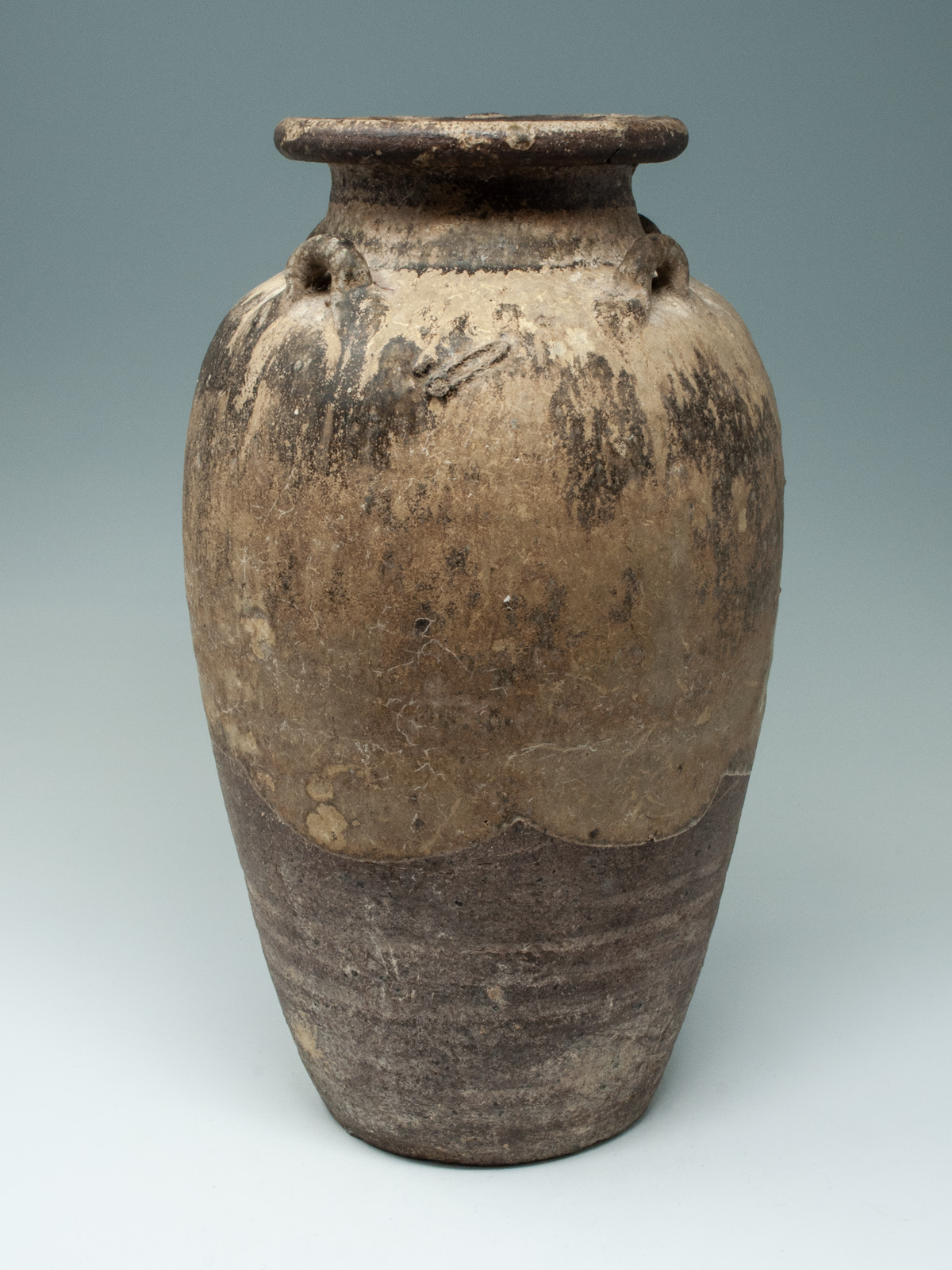 Storage jar Thailand Stoneware 12.5 inches (32 cm) by 7 inches (17.5 cm) in diameter 14th to 16th century Typical of Sukothai pottery from the Sawankhalok kilns, a nice storage jar with a sturdy repair on the rim, only visible from underneath. $500