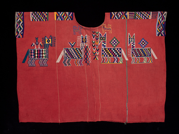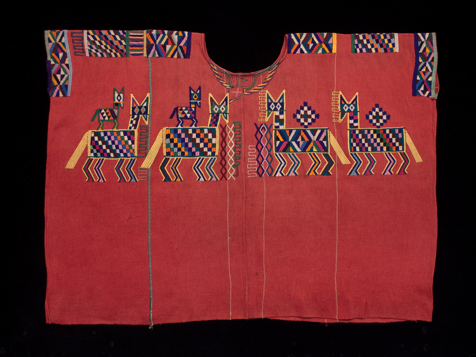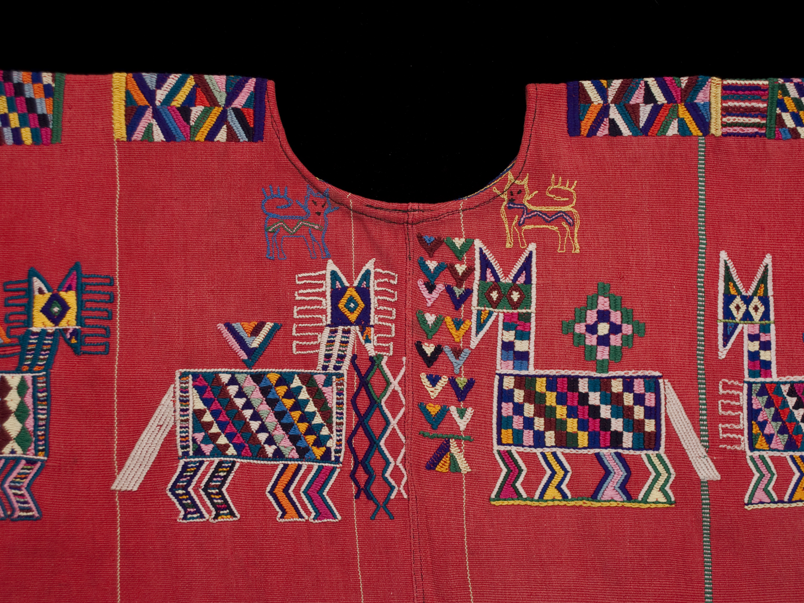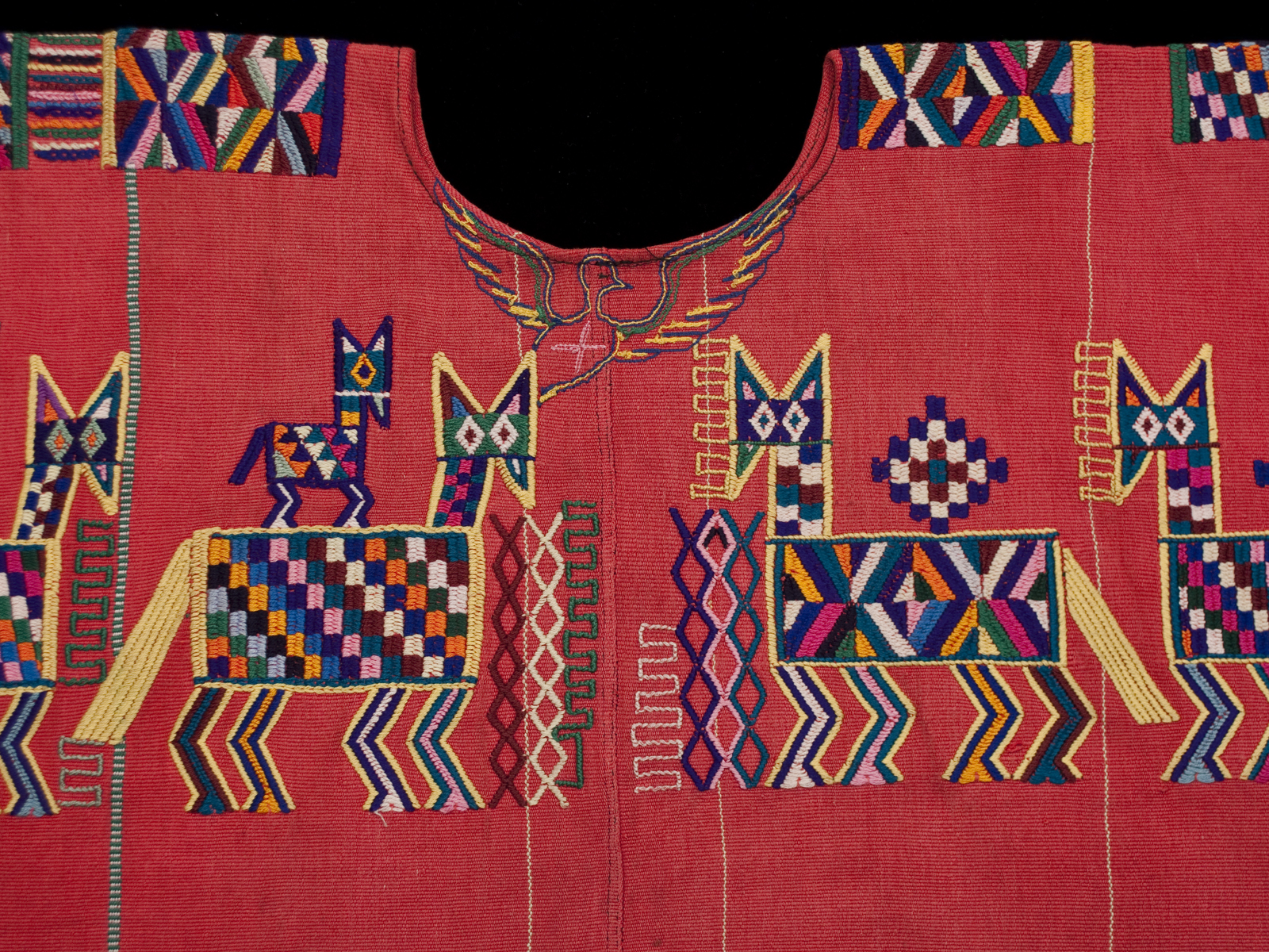 Handspun and backstrap loomed cotton make Chajul huipils strong and sturdy because while weaving the women stand instead of sitting or kneeling. This salmon-colored huipil is nevertheless soft with age and in addition to the supplementary weft geometric animals and birds, there are two free-form sewing machine stitched cats on the front and a flying bird on the back neck.