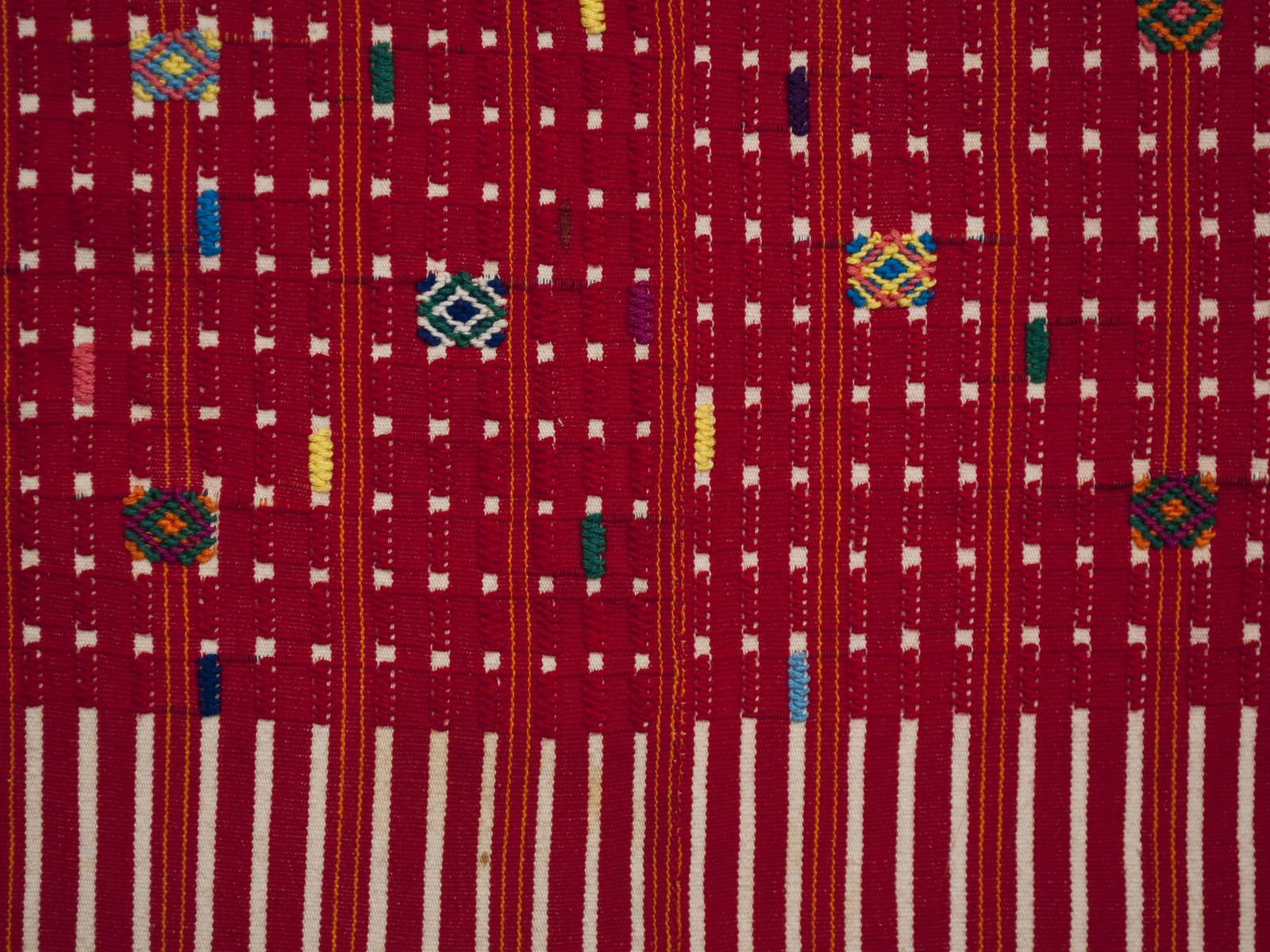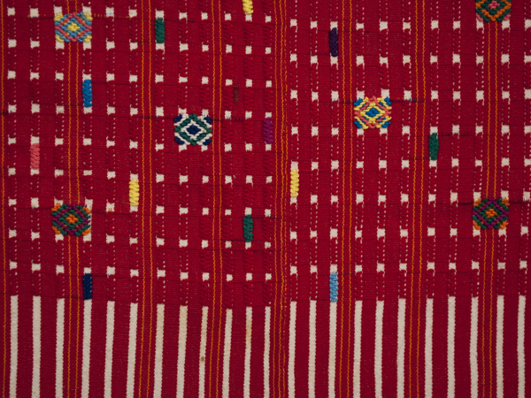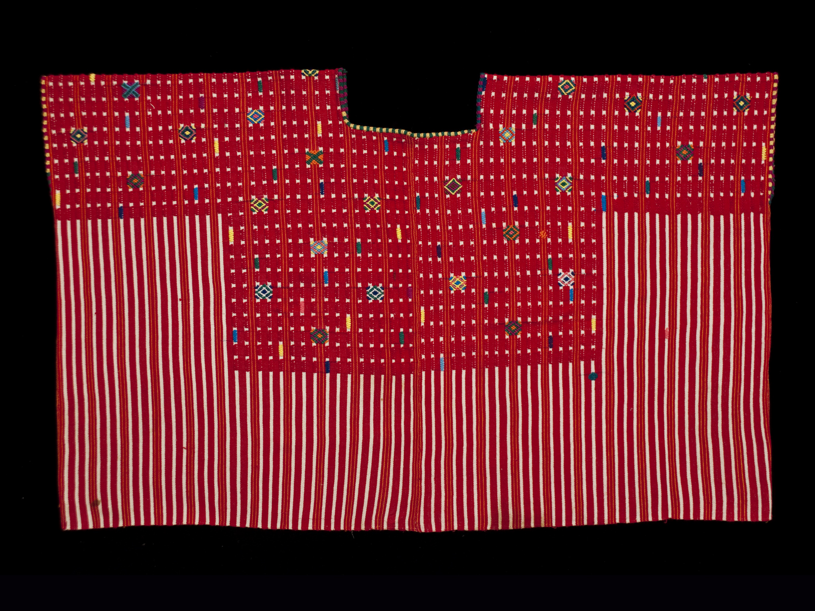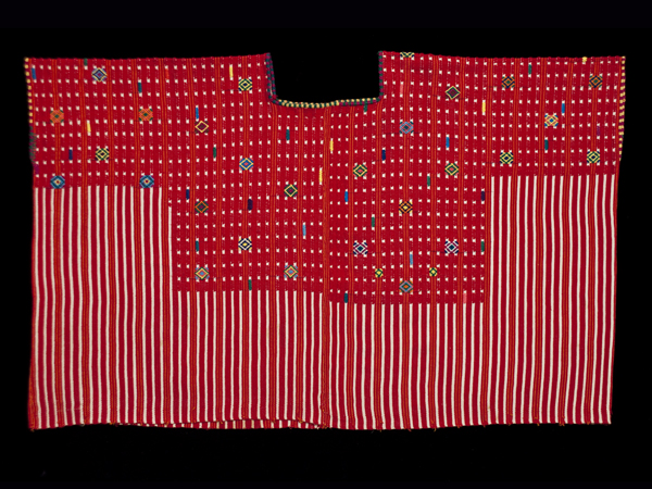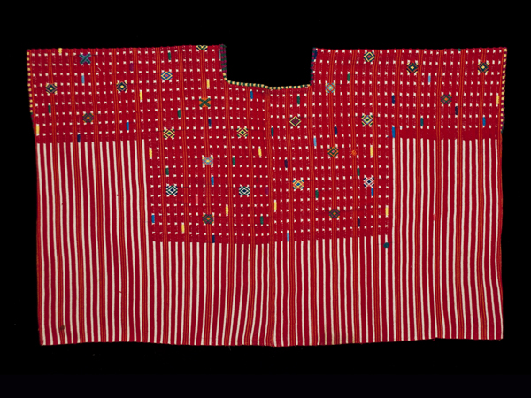 The body of this huipil was hand woven on a back-strap loom in two red and white warp-striped cotton panels and is decorated with the geometric designs characteristic of the huipils of this village. The small blue dot at the lower right corner of the central block is a supplementary weft rosette and the neck and armholes are chainstitched.