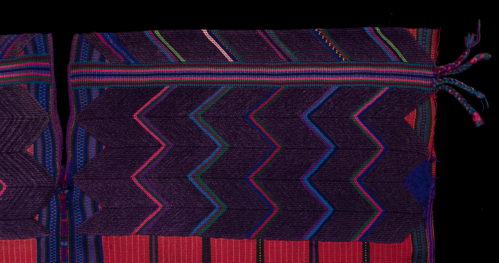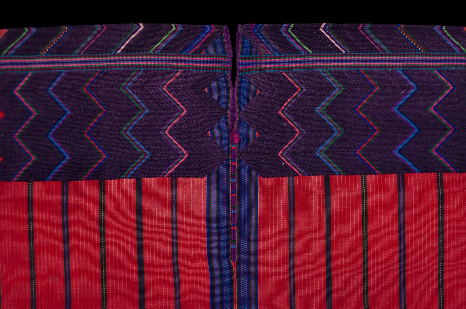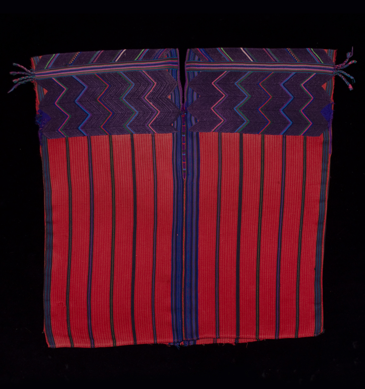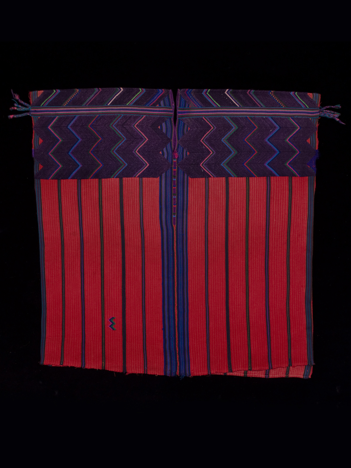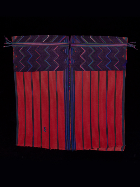 The handspun cotton threads for this huipil are woven in two long panels of red ground and fine yellow warp stripes, with wider stripes composed of very dark green, blue, red, and purple yarn. The shoulders are decorated with a soumak herringbone pattern in wool that is unique to this village, as are the four sets of "feathers" at the ends of the horizontal stripes. There is a small soumak 'signature' on the lower right front.