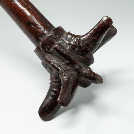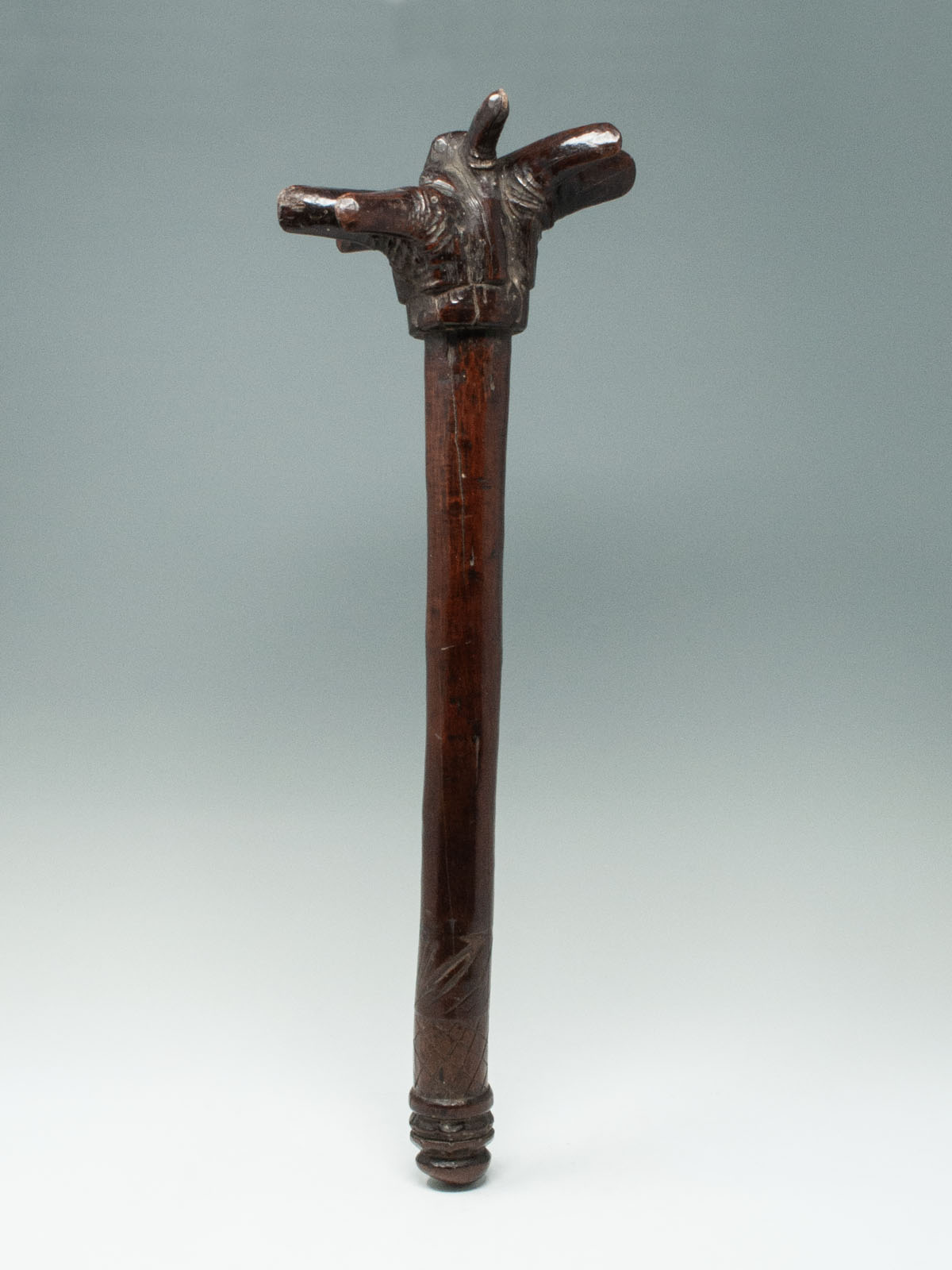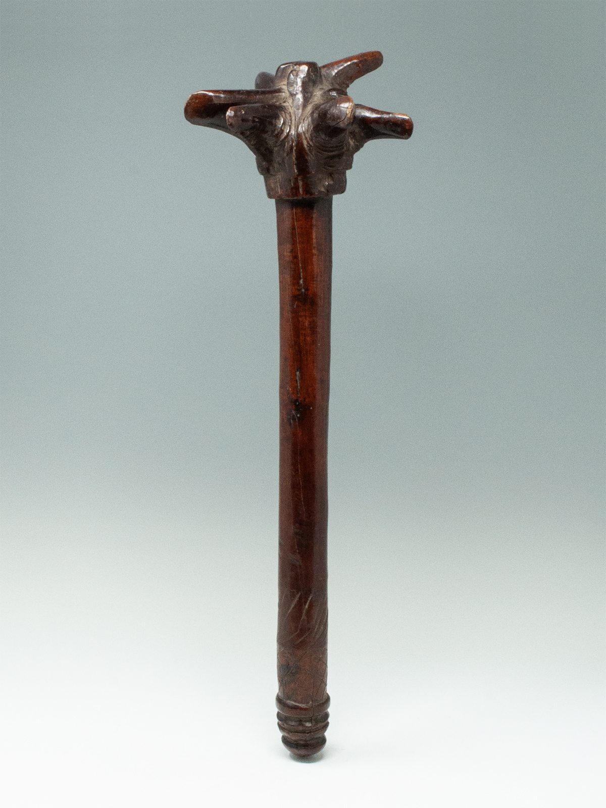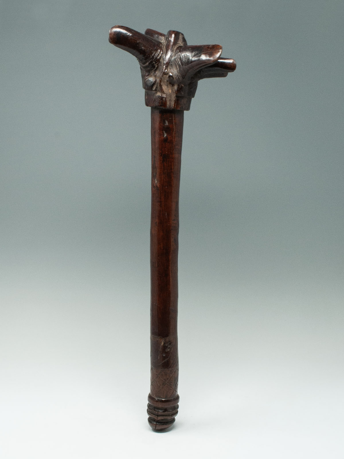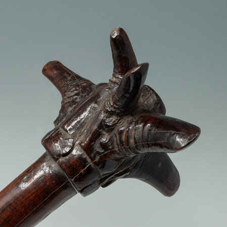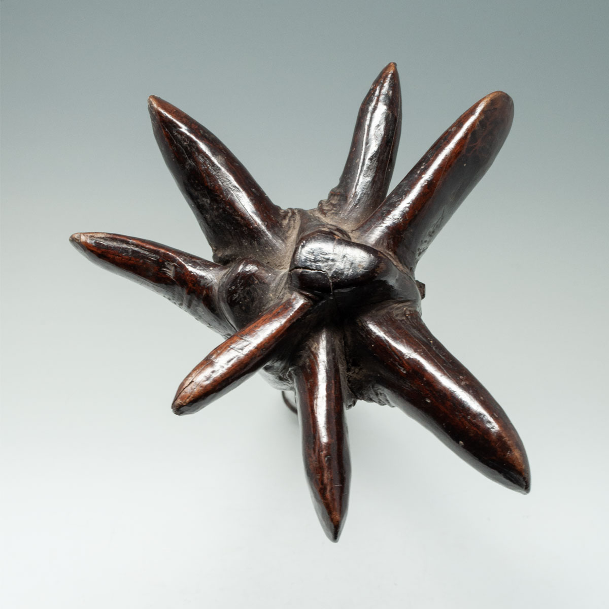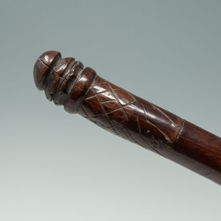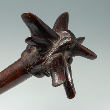 A lethal throwing club, which is thought by the last owner to be from Sumba Island. There are seven pointed spikes at the head supported by a thick handle terminating in two scalloped bands and some incised diamond shaped motifs. Smooth shiny patina.