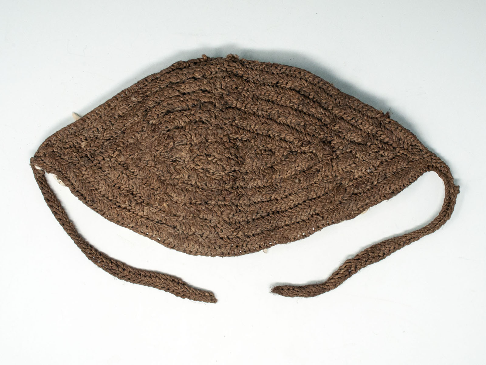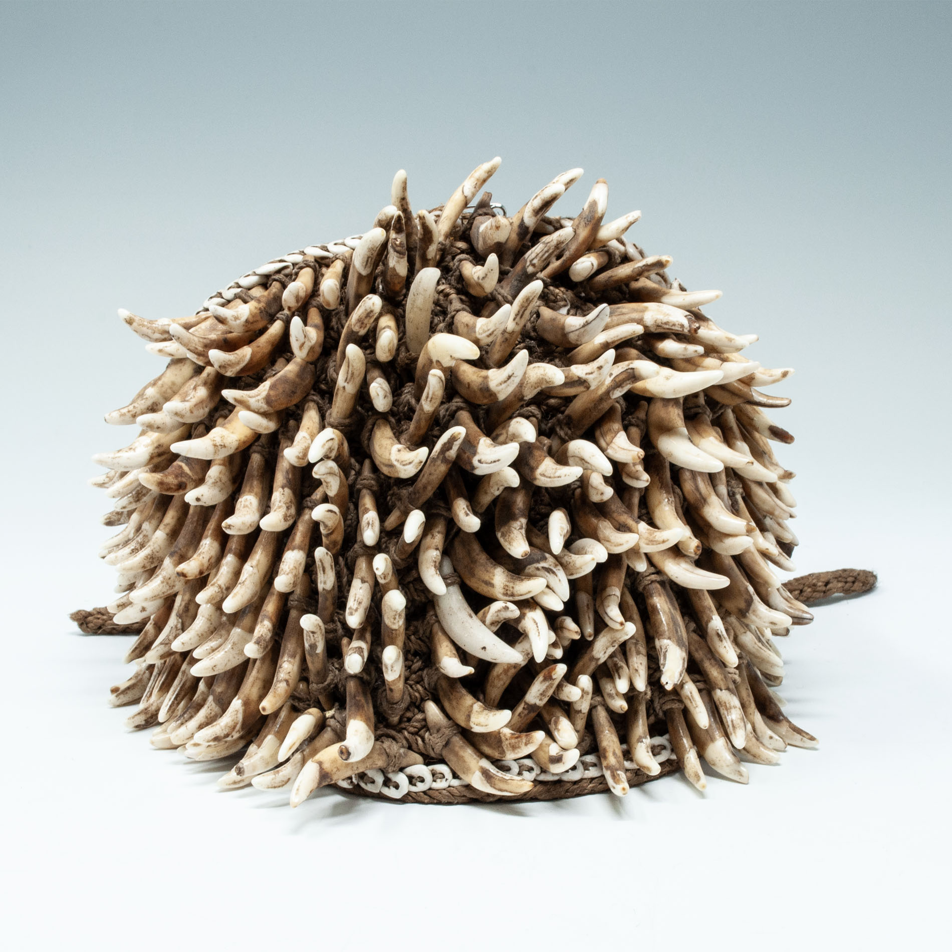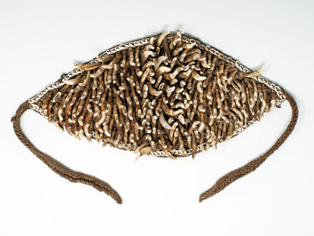 A large forehead ornament fashioned of woven bush string and dozens of dog teeth.