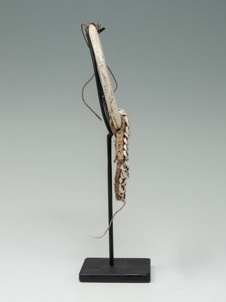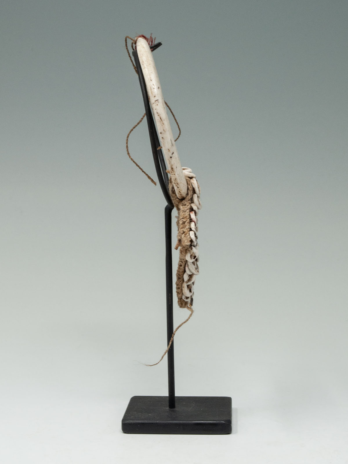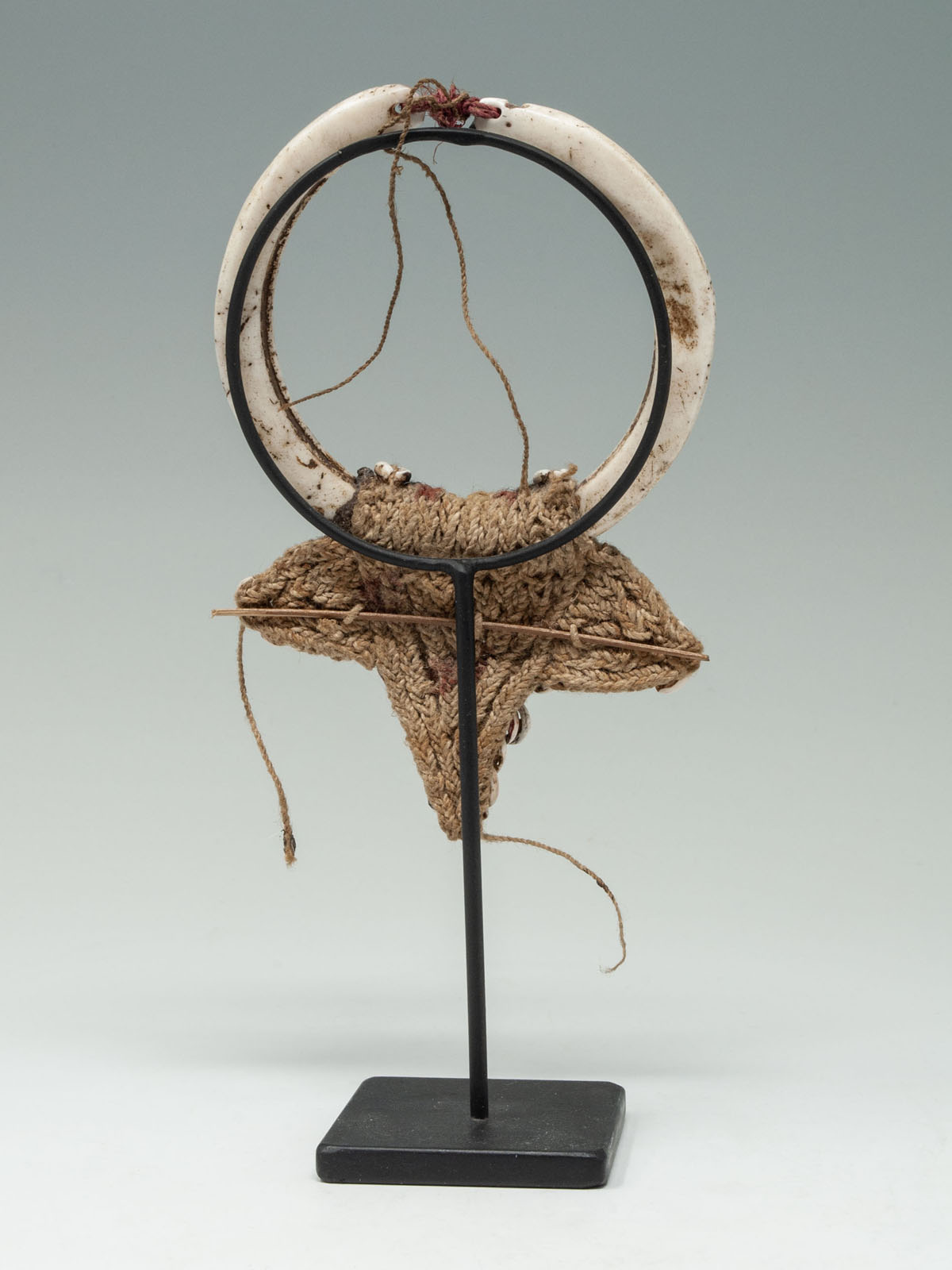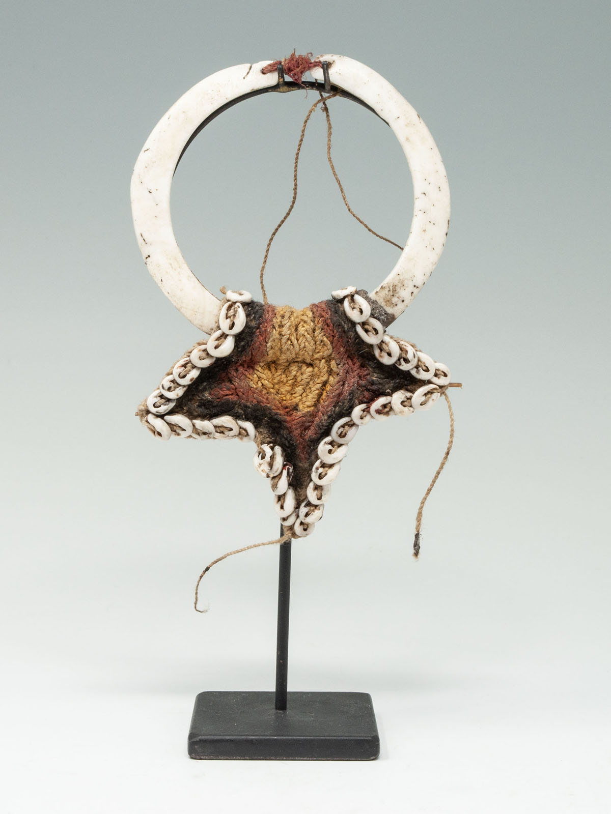 A nice nose ornament from Papua New Guinea composed of two carved pieces of shell resembling boar tusks and woven fiber bordered with nassa shells. Sold with a custom metal base.