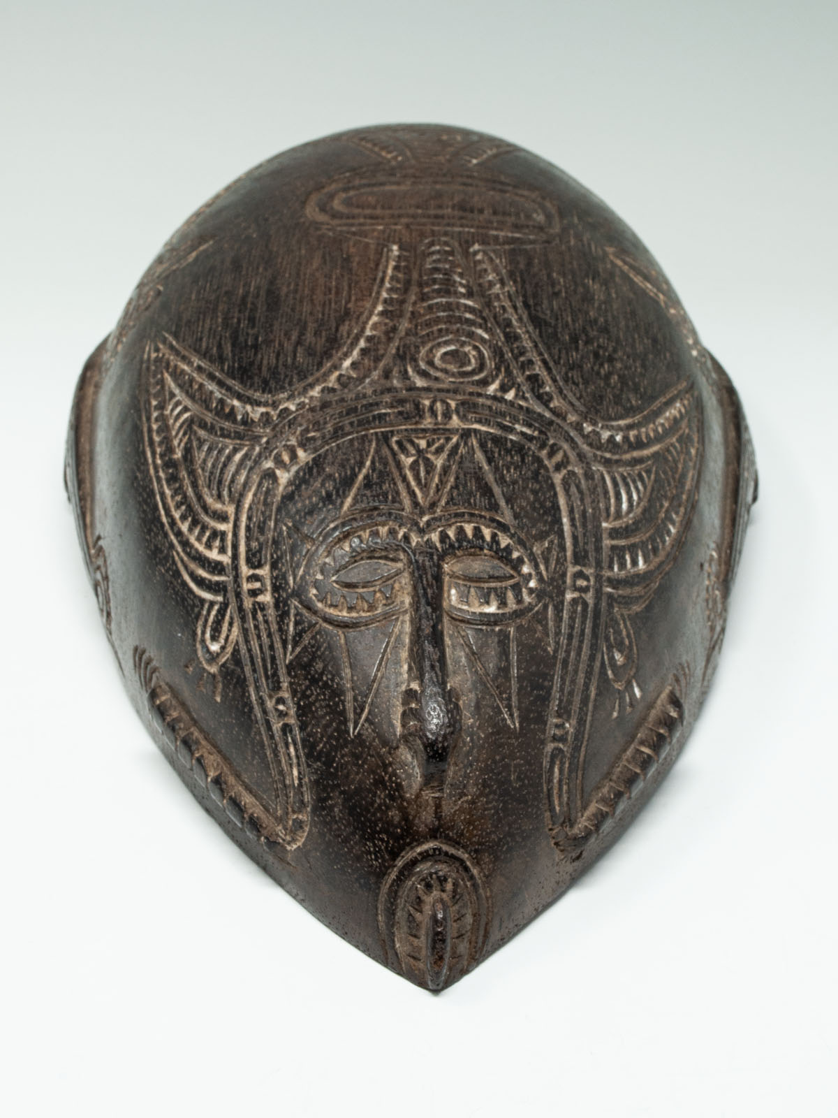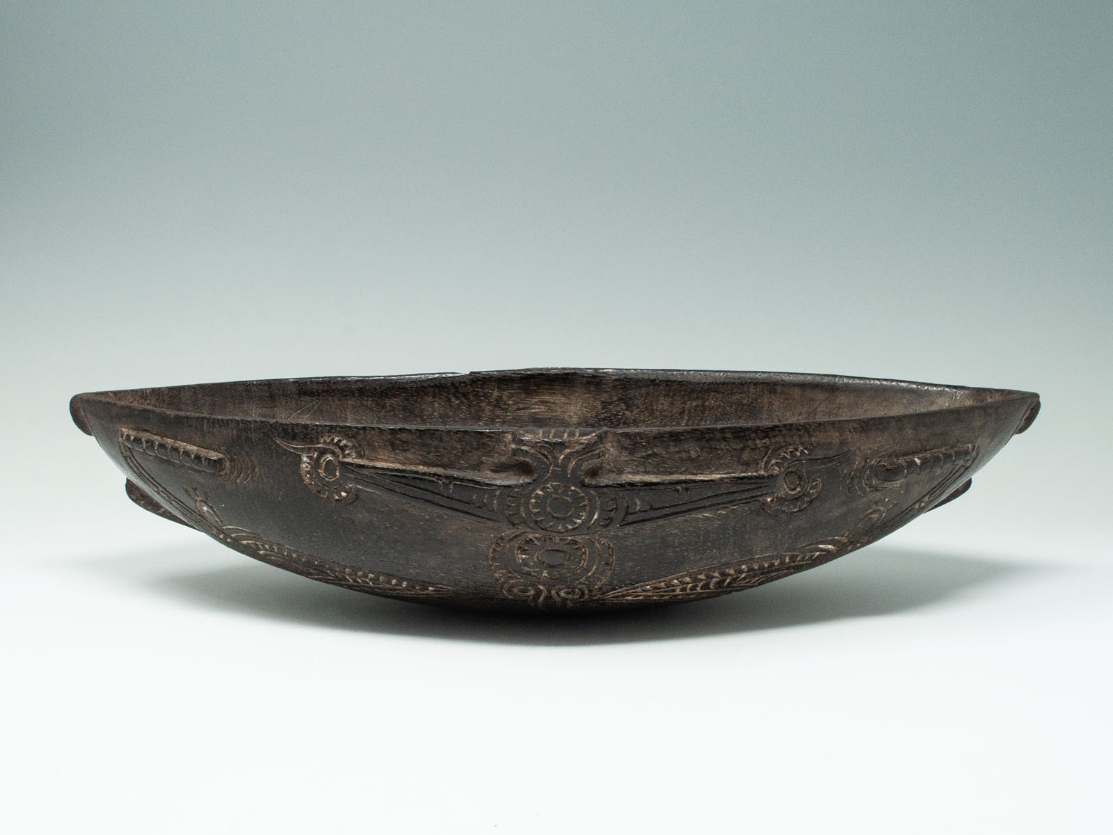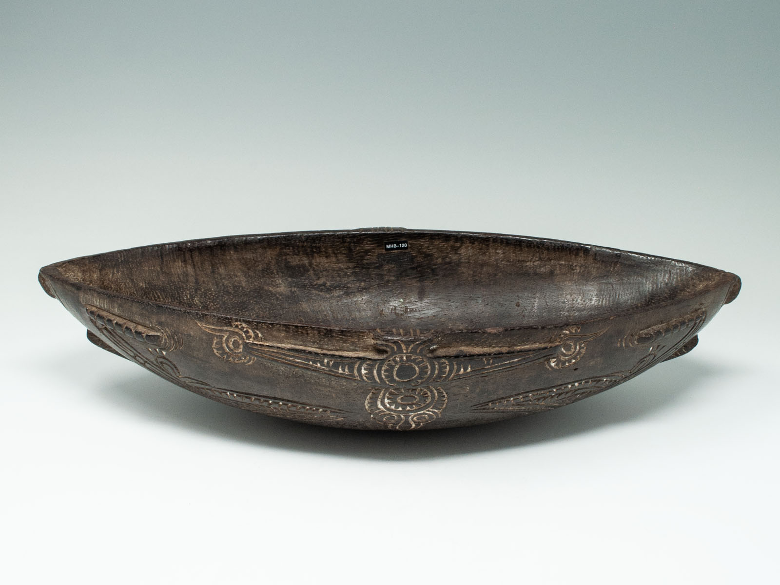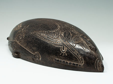 A small beautiful Tami Island bowl, decorated on the underside with relief carving infilled with lime, depicting an ancestor face at each end.