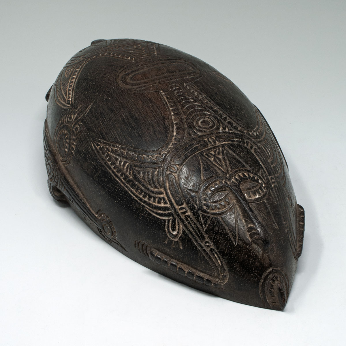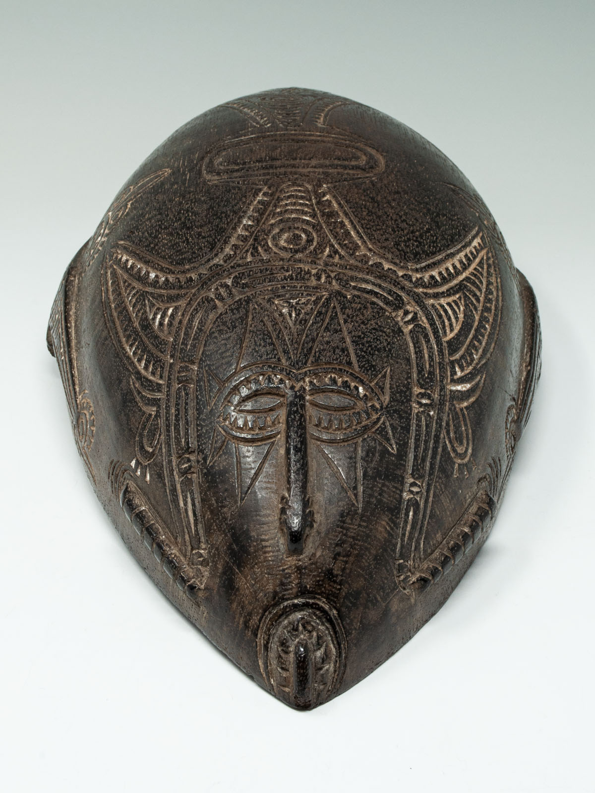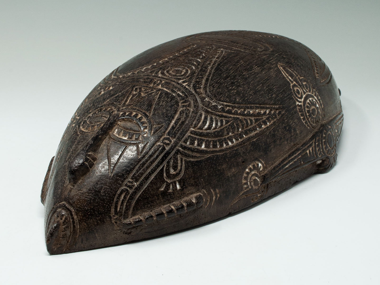 A small beautiful Tami Island bowl, decorated on the underside with relief carving infilled with lime, depicting an ancestor face at each end.