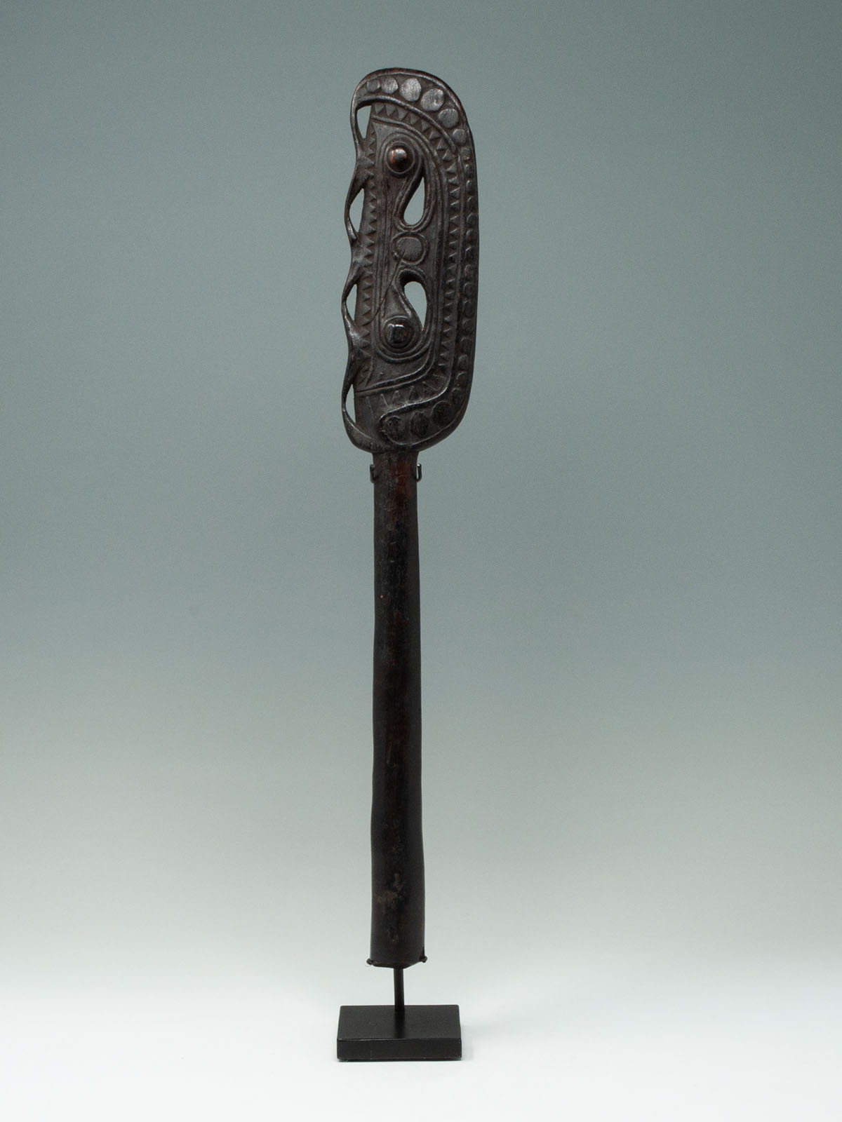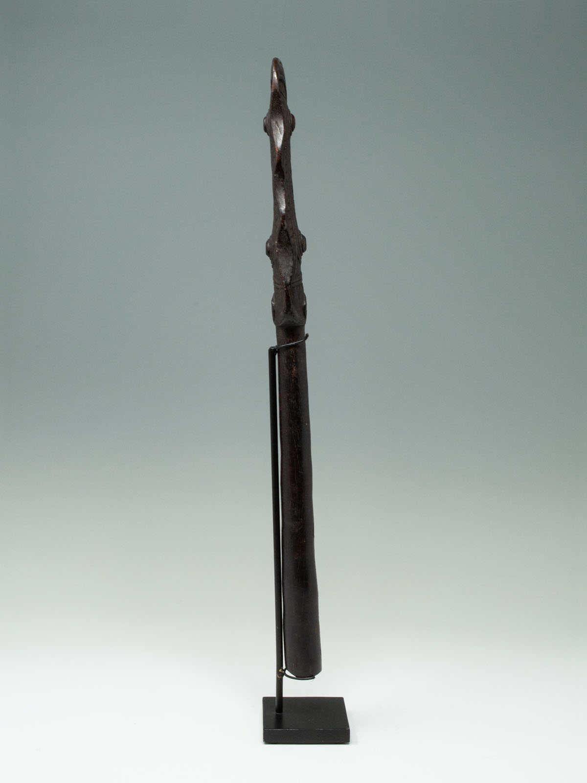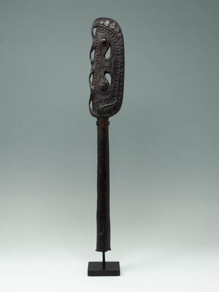 Considered a masterpiece, this paddle finial depicts two totemic bird heads facing one another and has a beautiful aged and glossy dark-brown patina. This particular example was most likely carved by the Munggwal clan, as referenced in Newton’s book. These handles were often carved similarly to the canoe prows and a related example can be seen in The Art of the Sepik River.