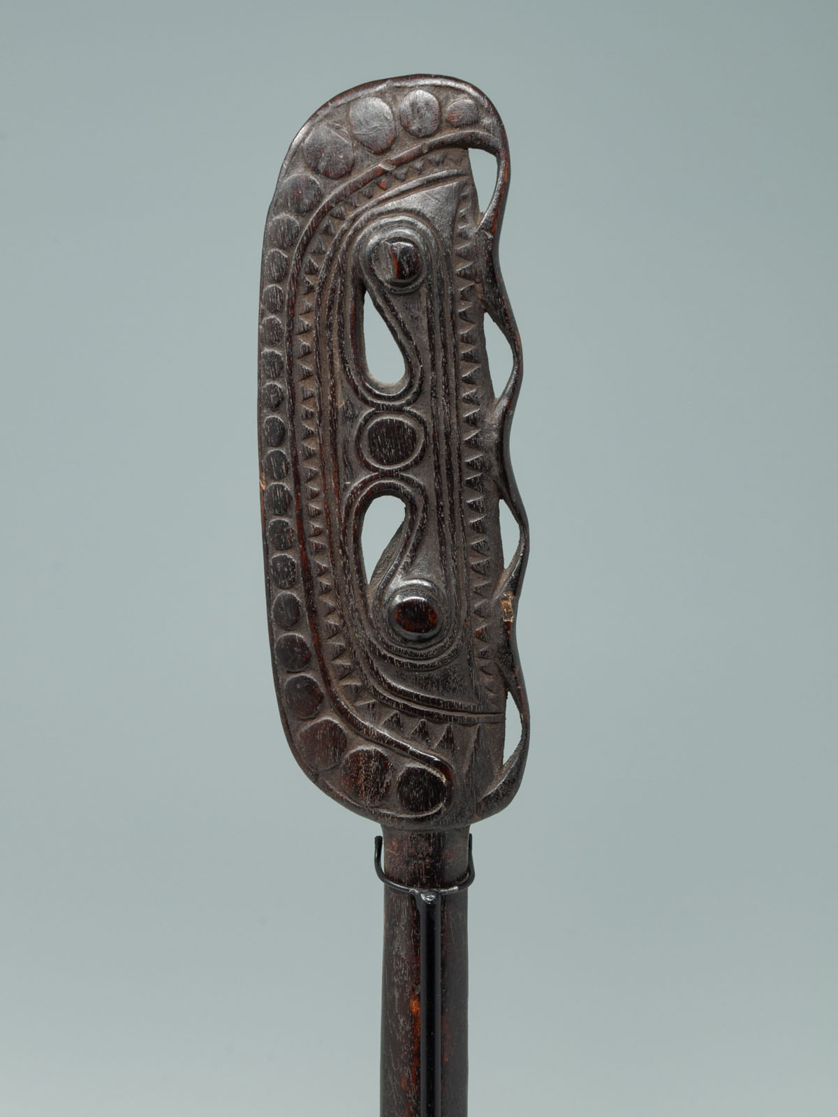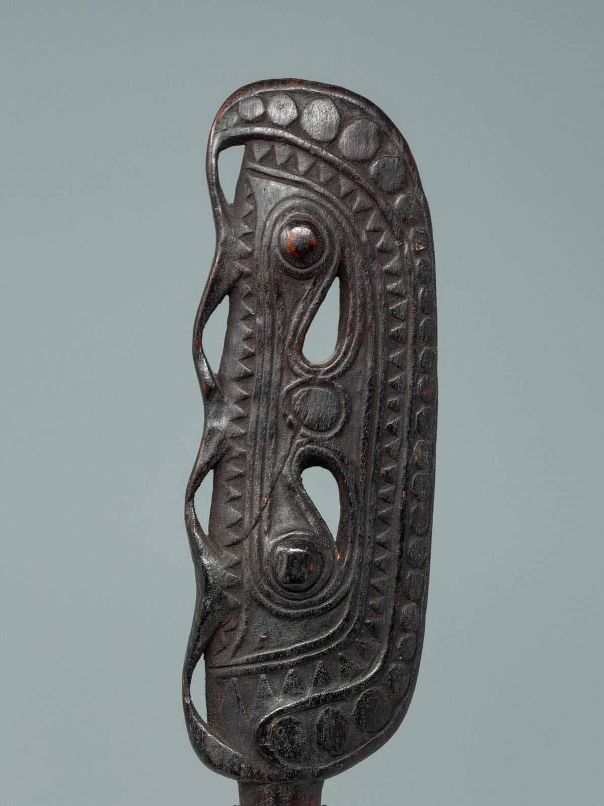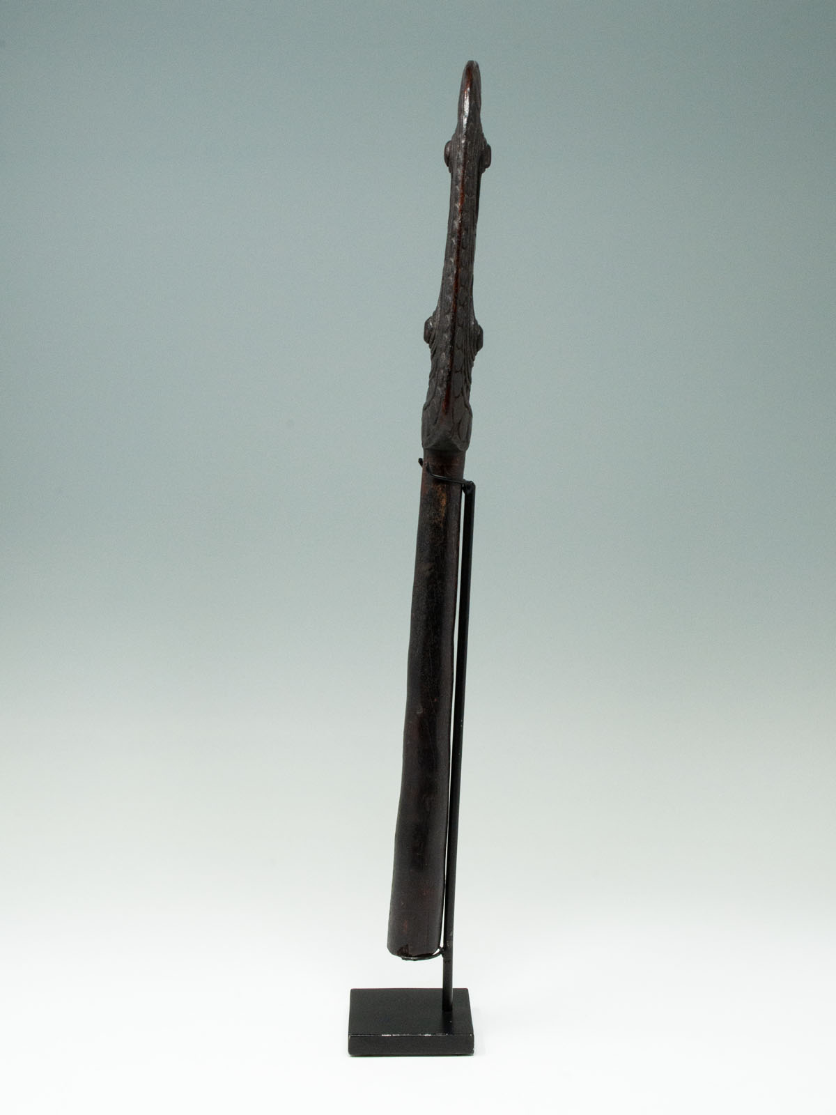 Considered a masterpiece, this paddle finial depicts two totemic bird heads facing one another and has a beautiful aged and glossy dark-brown patina. This particular example was most likely carved by the Munggwal clan, as referenced in Newton’s book. These handles were often carved similarly to the canoe prows and a related example can be seen in The Art of the Sepik River.