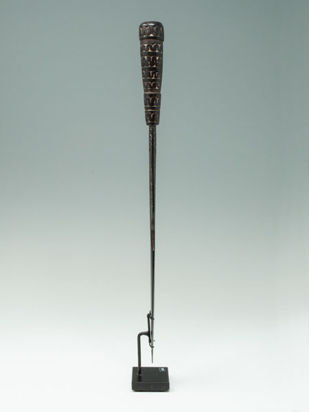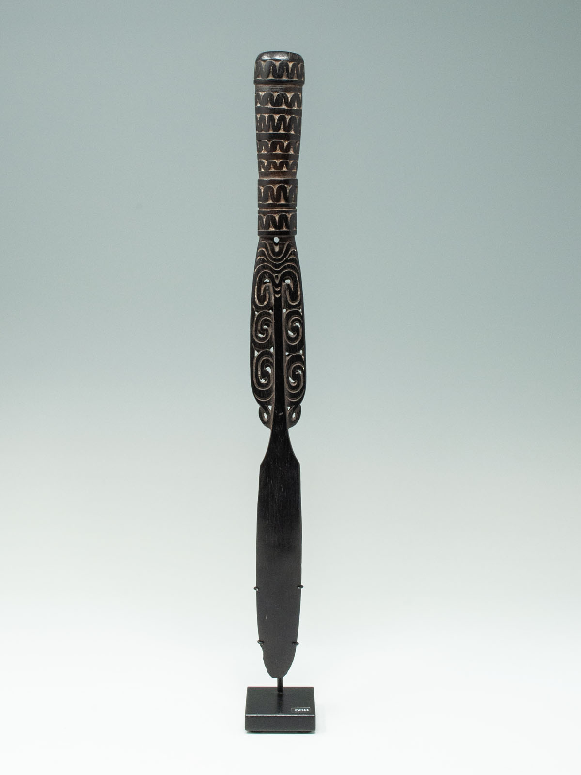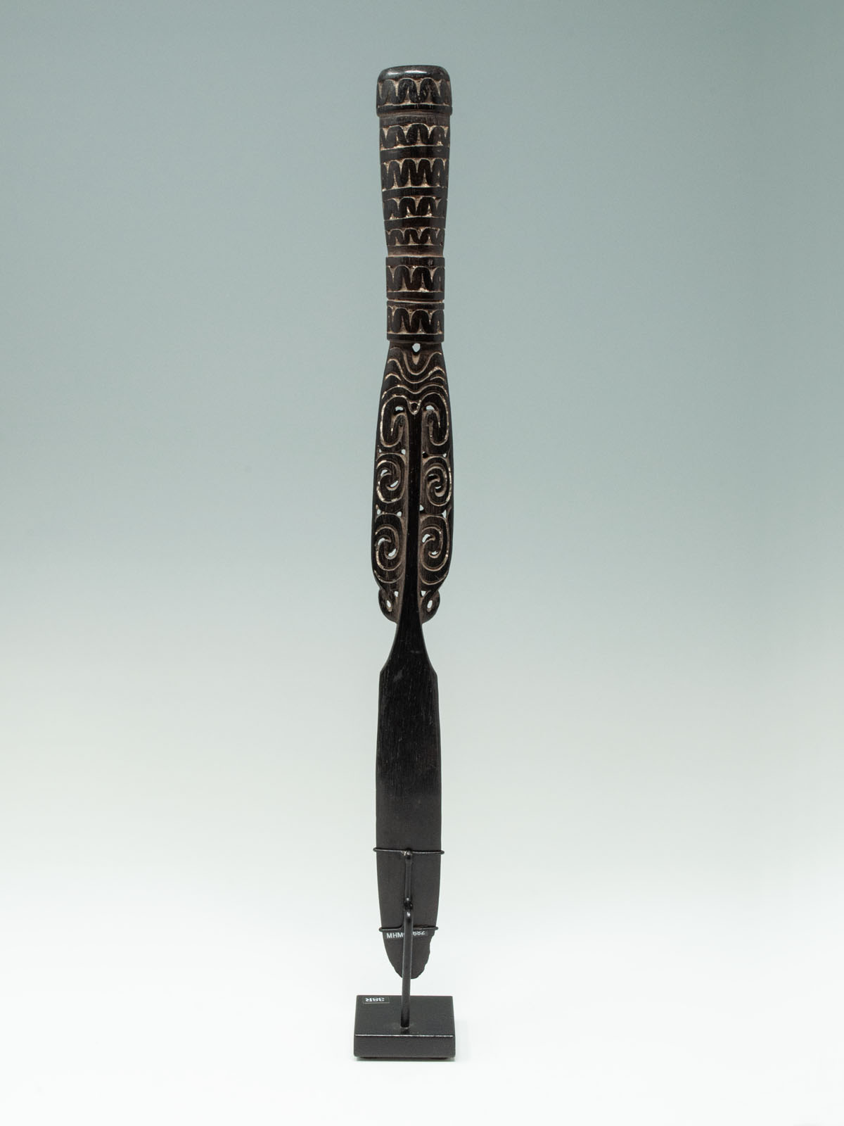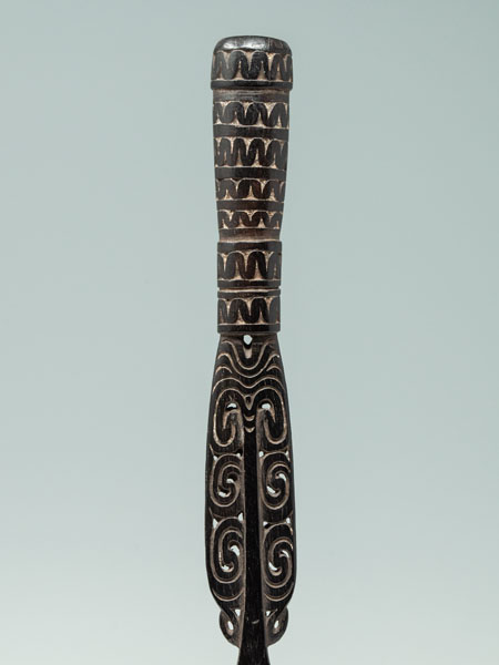 "The handle is formed by a betelnut mortar, a design of which there are a number of examples (cf. Beran 1980, Nr. 28, Beran 1988, Nr. 72). The pestle with which the betelnut is crushed can be used to pass the betelnut mush to the mouth. I have seen a man in Dobu so this from an ordinary mortar." Harry Beran