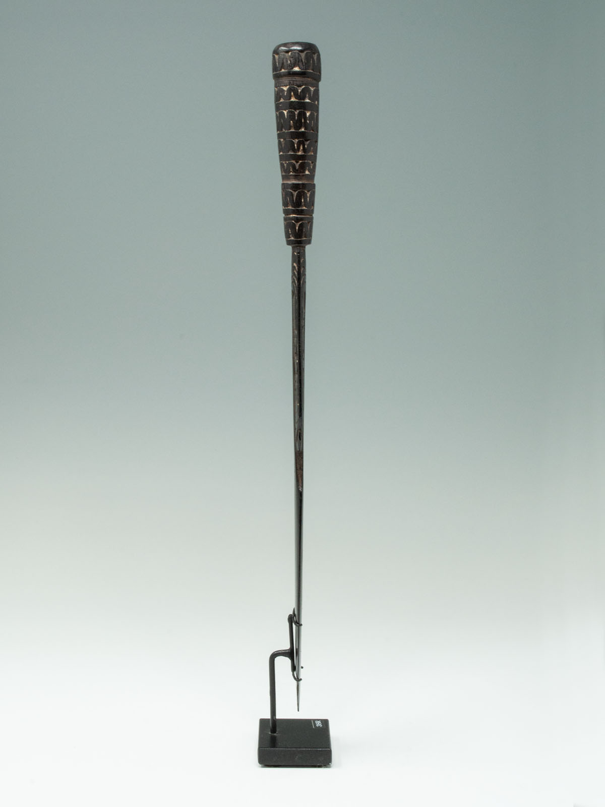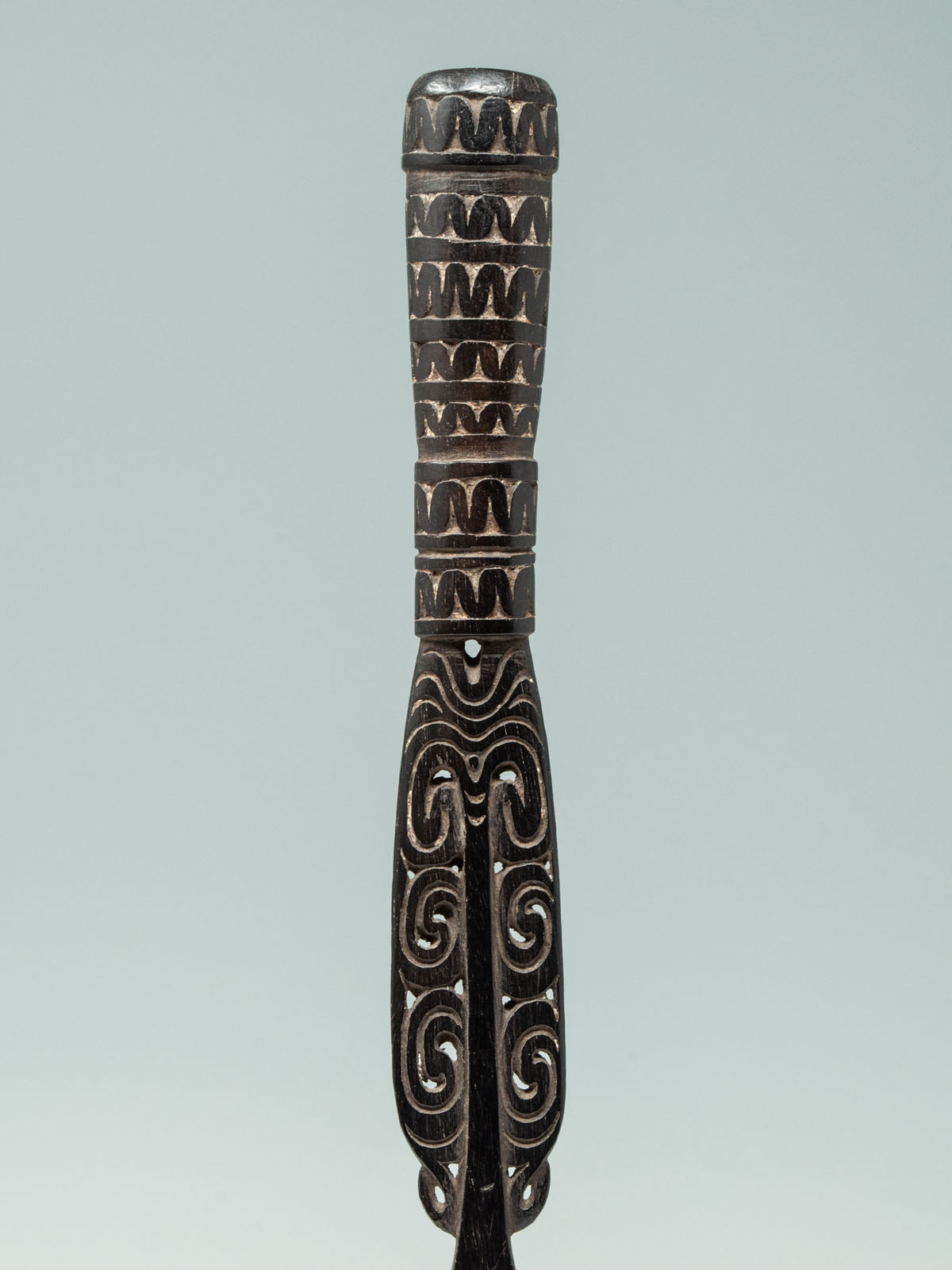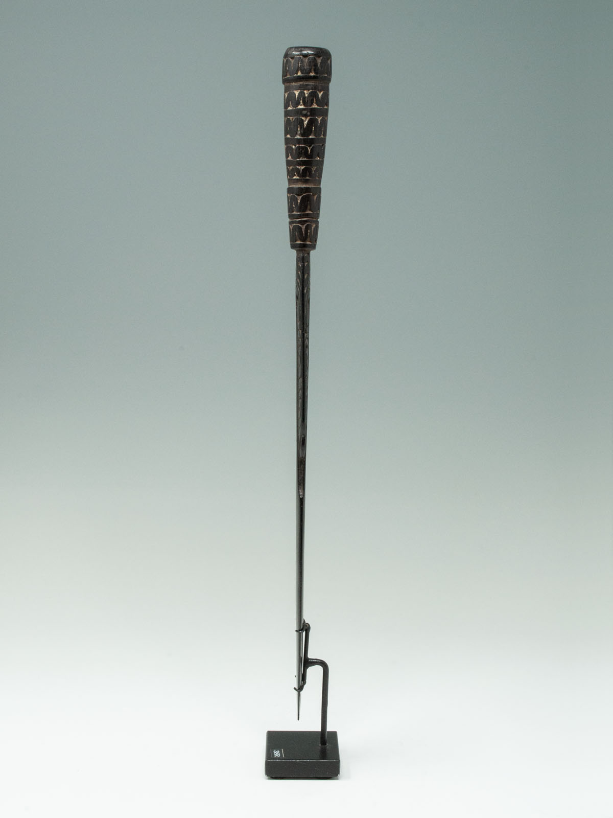 "The handle is formed by a betelnut mortar, a design of which there are a number of examples (cf. Beran 1980, Nr. 28, Beran 1988, Nr. 72). The pestle with which the betelnut is crushed can be used to pass the betelnut mush to the mouth. I have seen a man in Dobu so this from an ordinary mortar." Harry Beran